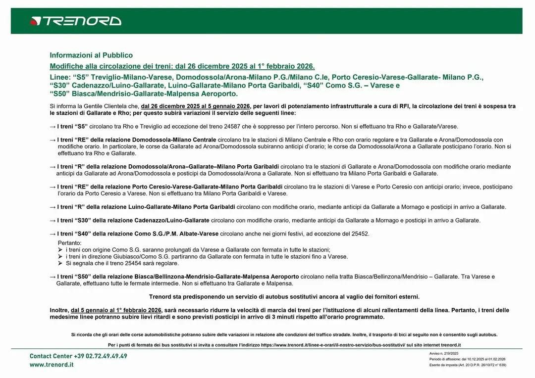 Dal 26 dicembre 2025 al 5 gennaio 2026 la circolazione ferroviaria sarà sospesa tra le stazioni di Gallarate e Rho.
