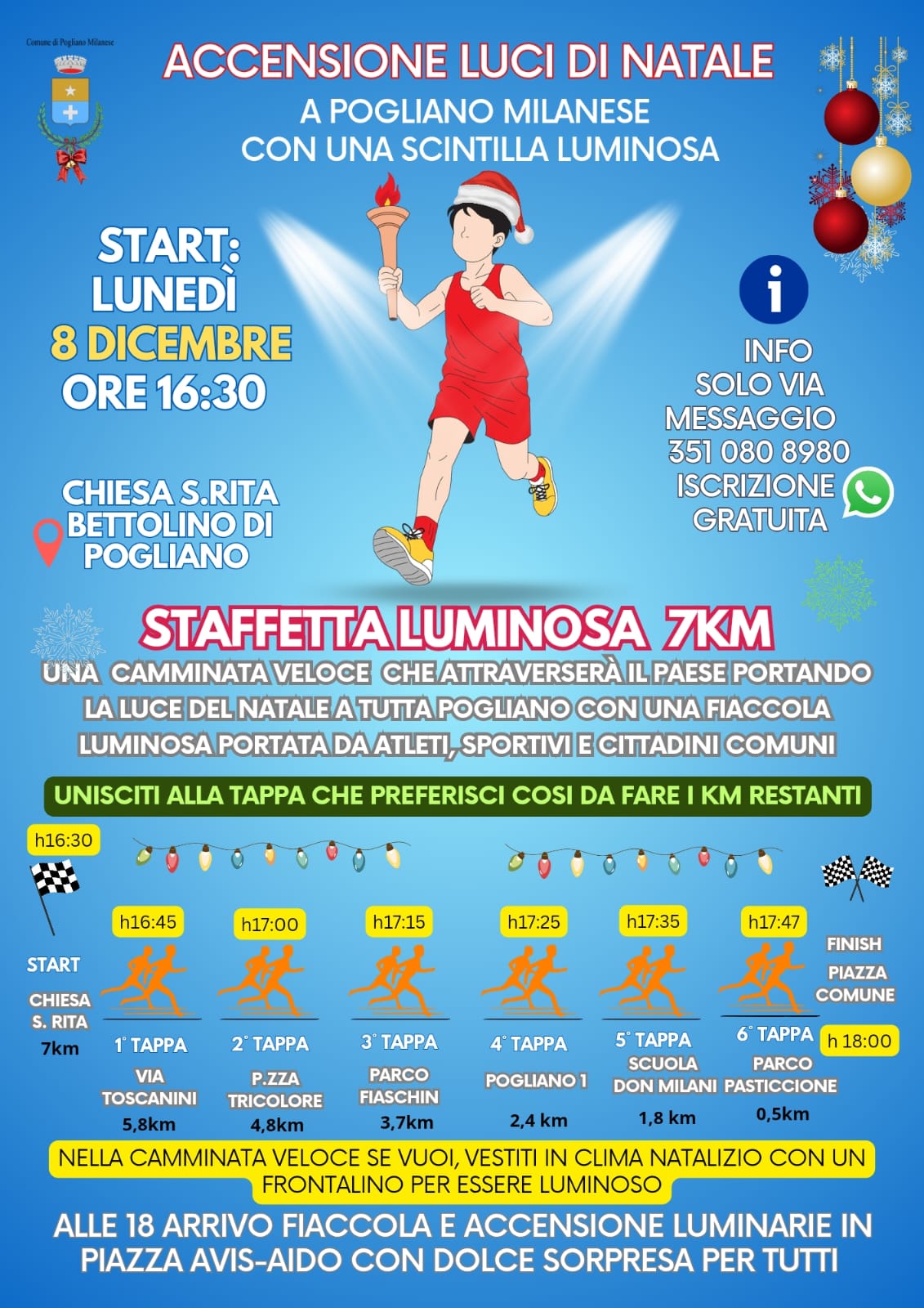 L’Amministrazione Comunale organizza per l’8 Dicembre 2025 la “Camminata Veloce Luminosa” per le vie di Pogliano Milanese e l’Accensione delle luci di Natale in piazza Volontari Avis Aido.