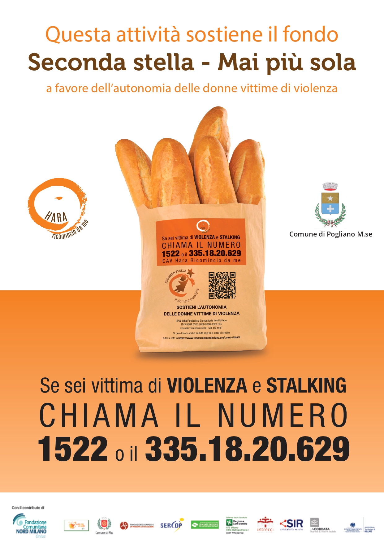 Dal prossimo 25 novembre, giornata internazionale per l’eliminazione della violenza contro le donne, al fine di sensibilizzare la cittadinanza su questo tema così importante e di grande attualità, 80.000 sacchetti del pane verranno distribuiti a più di 100 panettieri nei 17 comuni degli ambiti del garbagnatese e del rhodense, tra cui Pogliano Milanese. Un’operazione capillare per diffondere i numeri telefonici di emergenza del Centro Antiviolenza Hara – Bollate e Rho (1522 oppure 335.18.20.629) e per promuovere il fondo “Seconda stella – Mai più sola” a sostegno dell’autonomia delle donne vittime di violenza, istituito presso Fondazione Comunitaria Nord Milano Onlus.