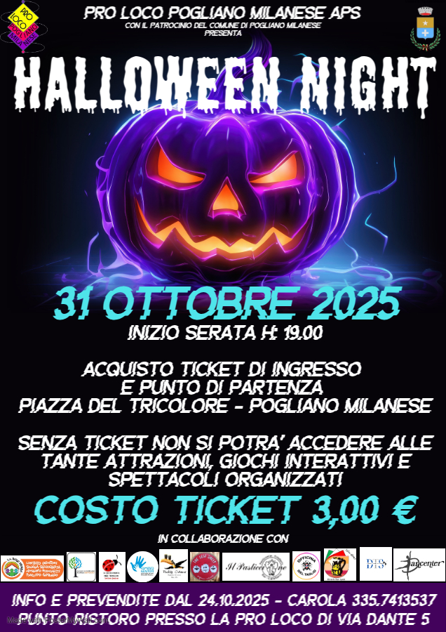 La Pro Loco Pogliano Milanese APS, con il patrocinio del Comune di Pogliano Milanese, è lieta di invitare tutti i cittadini alla Halloween Night, una serata ricca di divertimento, spettacoli e giochi interattivi per grandi e piccini!
