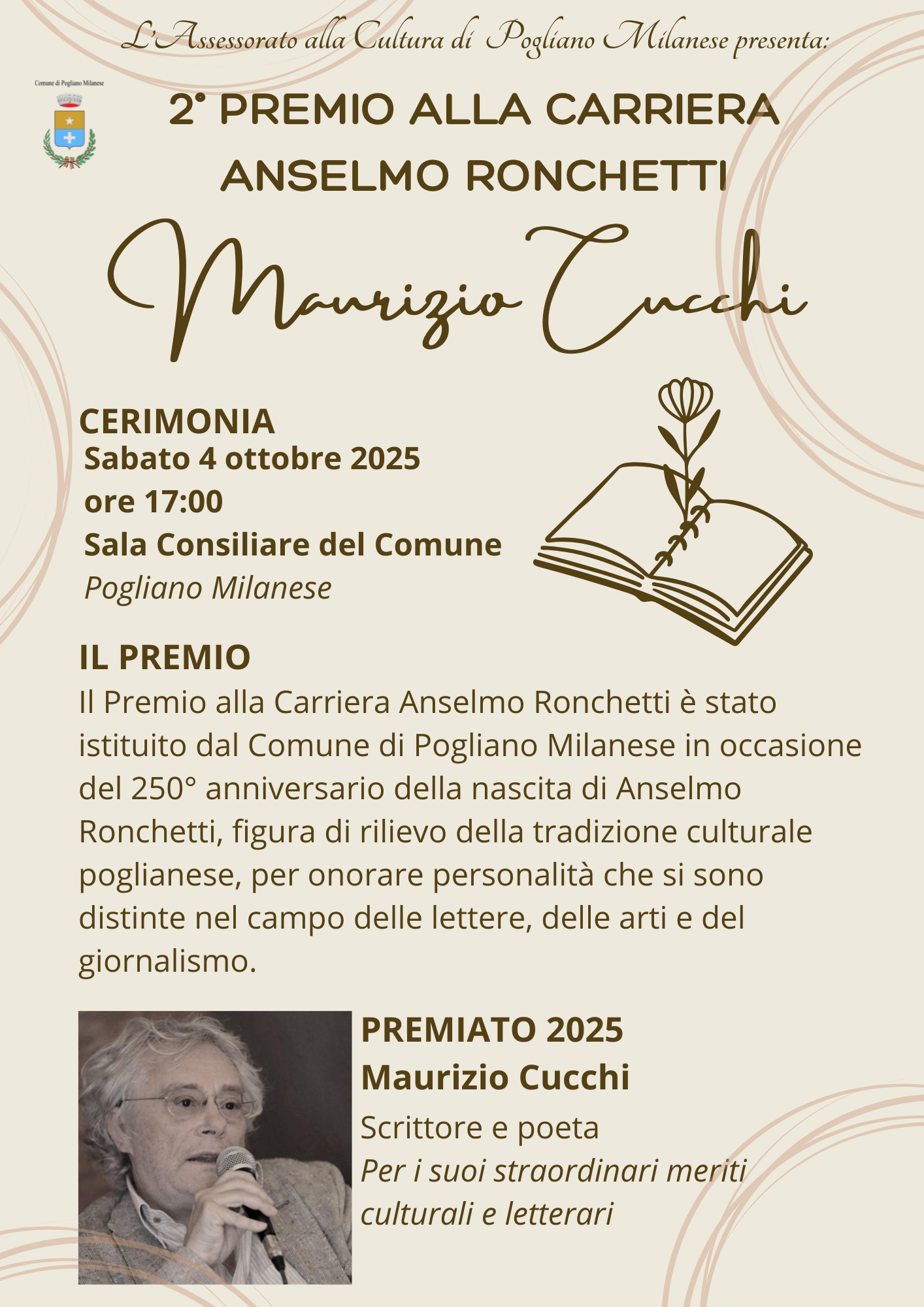 Il Comune di Pogliano Milanese è lieto di annunciare la seconda edizione del Premio alla Carriera Anselmo Ronchetti, che verrà assegnato sabato 4 ottobre 2025 alle ore 17:00 presso la Sala Consiliare del Comune.