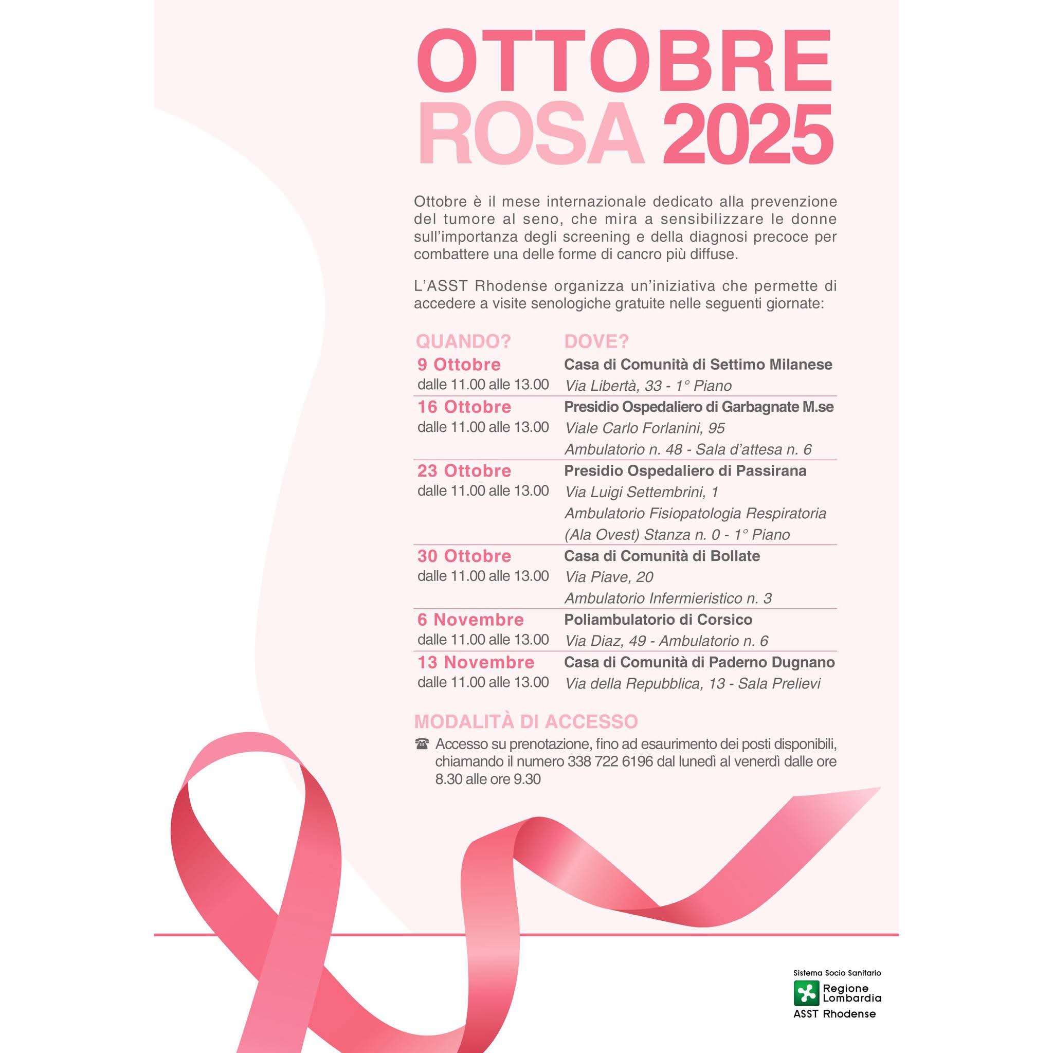 L’ASST Rhodense organizza anche quest’anno l’iniziativa “Ottobre Rosa 2025”, offrendo ai cittadini del nostro territorio la possibilità di accedere gratuitamente a visite senologiche presso diverse sedi del distretto.