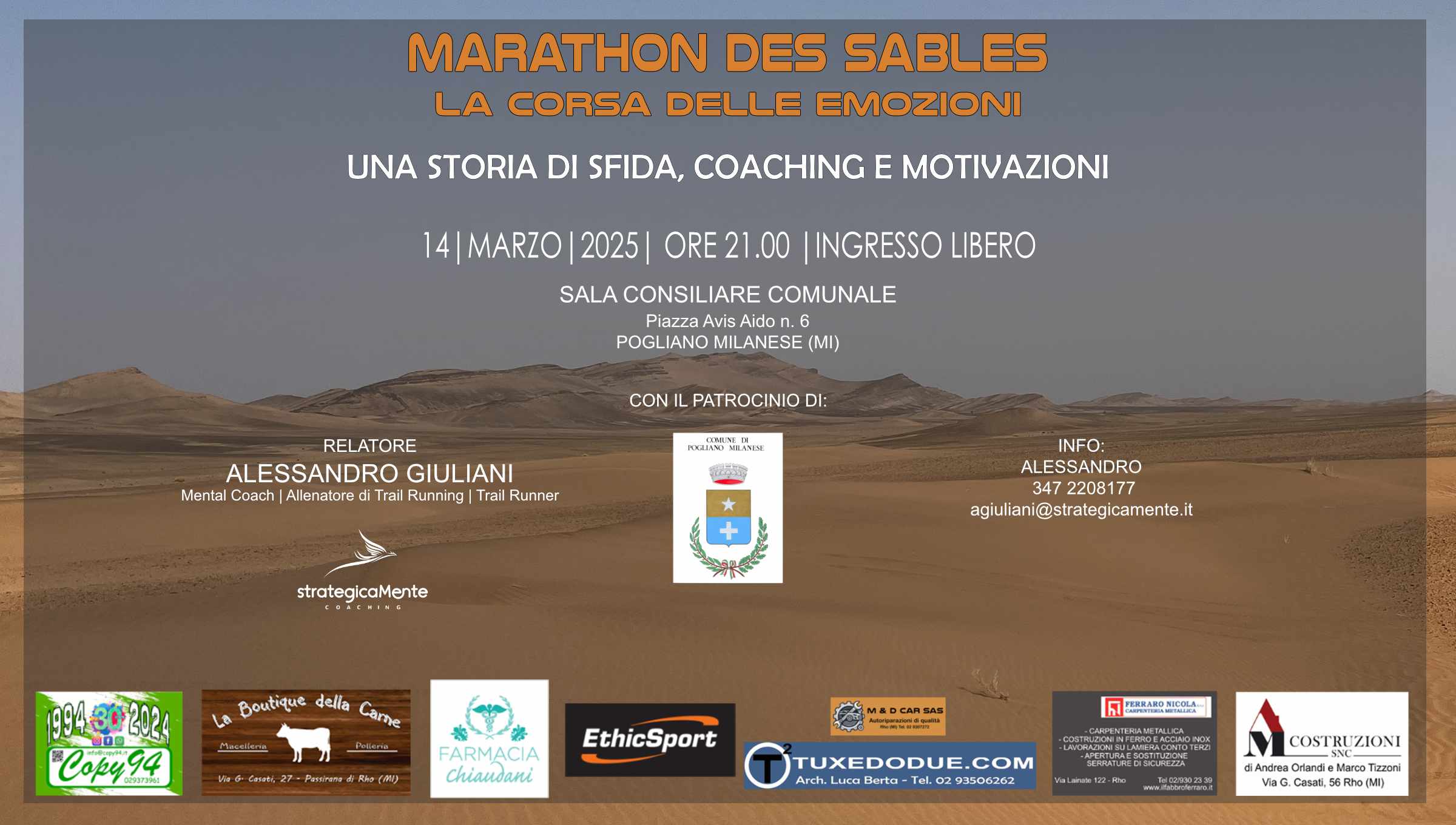 – 14 marzo 2025 alle ore 21:00 in sala consiliare Alessandro Giuliani, mental coach, allenatore di trail running e trail runner, ci parlerà della sua partecipazione all’edizione 2024 della MARATHON DES SABLES una storia di sfide, coaching e motivazioni. La partecipazione alla corsa è stata patrocinata dal Comune (allegato volantino).
