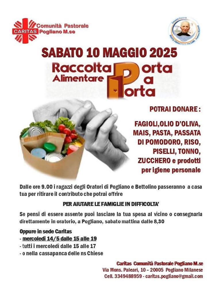 La Comunità Pastorale di Pogliano Milanese organizza per sabato 10 maggio 2025 una grande iniziativa di solidarietà: la Raccolta Alimentare Porta a Porta, promossa da Caritas per aiutare le famiglie in difficoltà del nostro territorio.