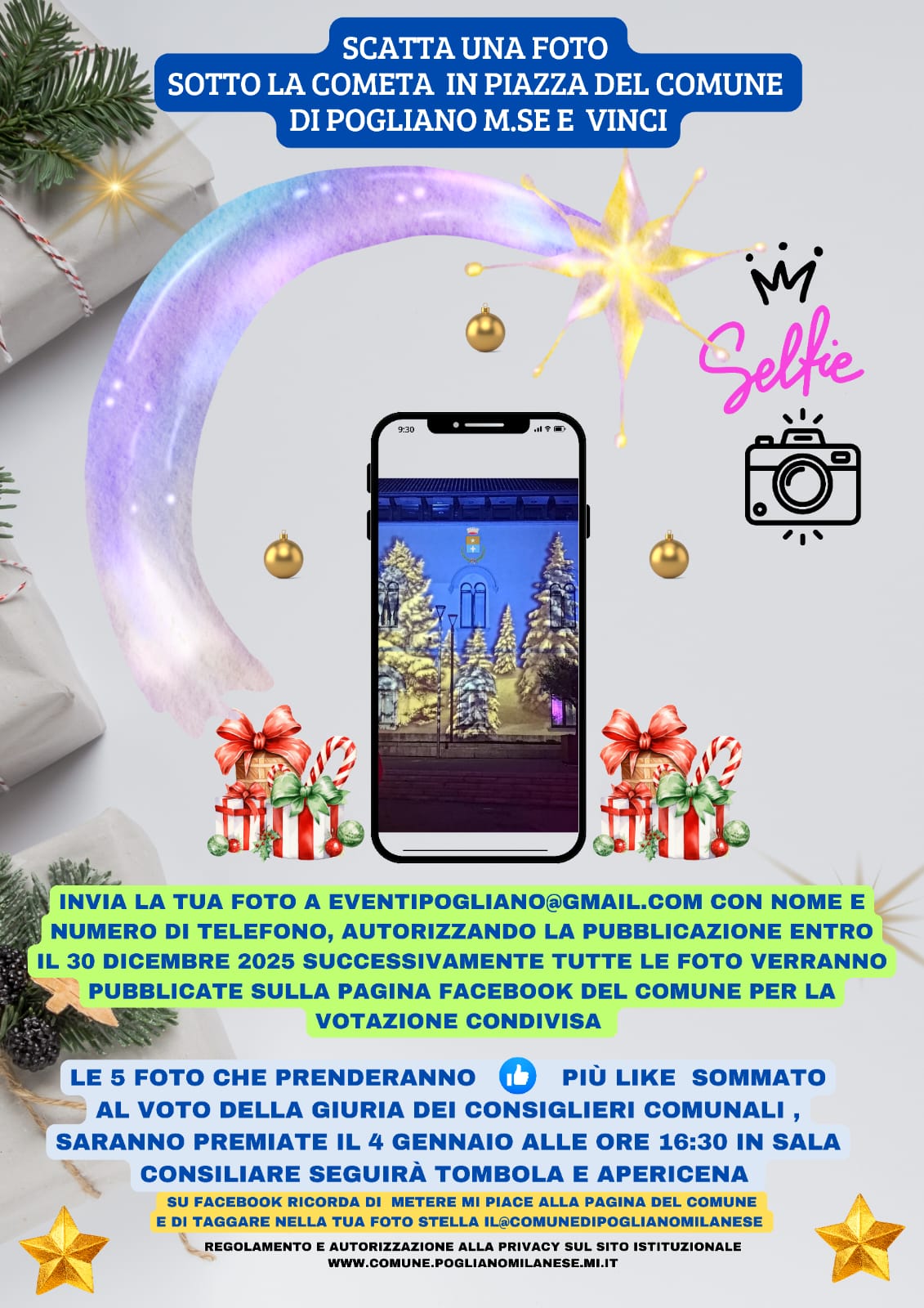 Il Comune di Pogliano Milanese promuove l’iniziativa “Scatta una foto sotto la cometa in piazza del Comune di Pogliano Milanese e vinci!”.